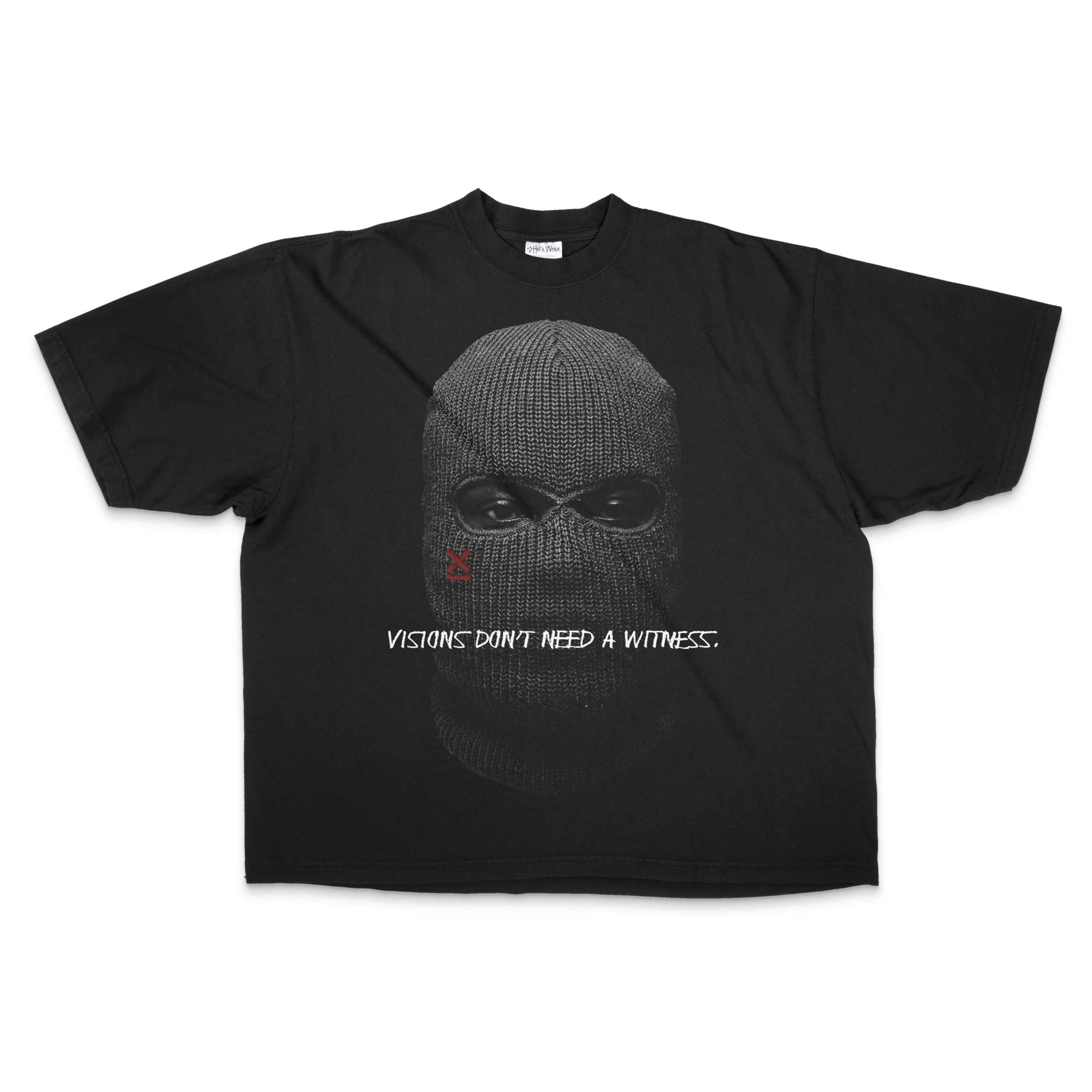 Black oversized heavyweight tee. The ski mask graphic represents the idea that your vision doesn’t need an audience. Build in silence. Let the work speak for itself.